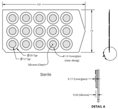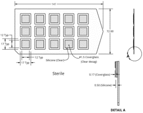 產(chǎn)品由上下兩部分構(gòu)成:上層是No.1.5厚度的玻璃蓋玻片,下層是0.5mm厚度的透明硅膠片,無(wú)菌包裝可直接使用。設(shè)計(jì)上硅膠片較玻璃片略大,比如蓋玻片12*12mm大小,下方的硅膠片17*17mm大小,產(chǎn)品大小特別適于培養(yǎng)皿和培養(yǎng)板使用。包裝時(shí),背襯底板是透明大塑料板,一板15個(gè),一包有5板(共計(jì)75個(gè))。
