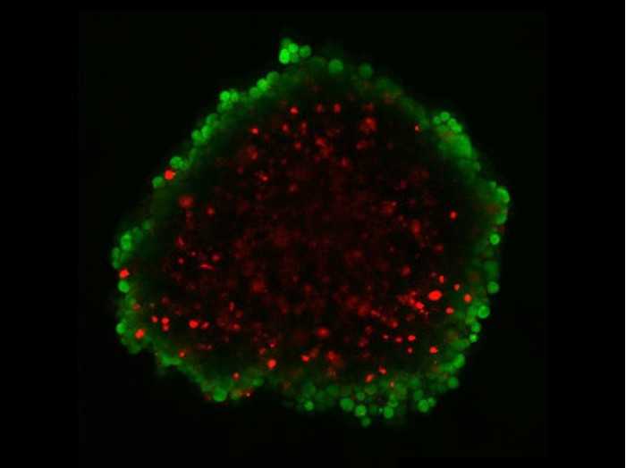 HepG2 球體的共聚焦激光掃描部分。 HepG2 細胞球體使用基于瓊脂糖的液體覆蓋技術(shù)生成,并轉(zhuǎn)移到 µ-Dish 35 mm、高壁生物惰性培養(yǎng)皿。 FDA(綠色)表示外球體層的活細胞。 PI(紅色)標記壞死球體中心內(nèi)的死細胞。 顯微鏡:蔡司 LSM 710,平面復(fù)消色差物鏡 10x/0.45。 比例尺為 200 µm。