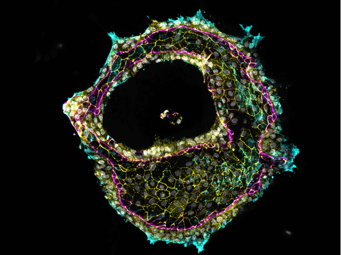 在µ-Slide 8 Well high用膠原蛋白I包被的ibiTreat µ-Pattern(cir500,pit1000)上培養(yǎng)的成人來源干細(xì)胞類器官。細(xì)胞接種24小時后,用膠原蛋白I凝膠覆蓋,再培養(yǎng)24小時。細(xì)胞用DAPI(灰色)和Phalloidin(品紅色)染色,并用ZO-1(黃色)和MYH9(青色)進(jìn)行免疫染色。該圖像為使用奧林巴斯FV3000顯微鏡20倍物鏡采集的z-stack的最大投影復(fù)合熒光圖像。圖片由新加坡國立大學(xué)Kim Whye Leong提供。