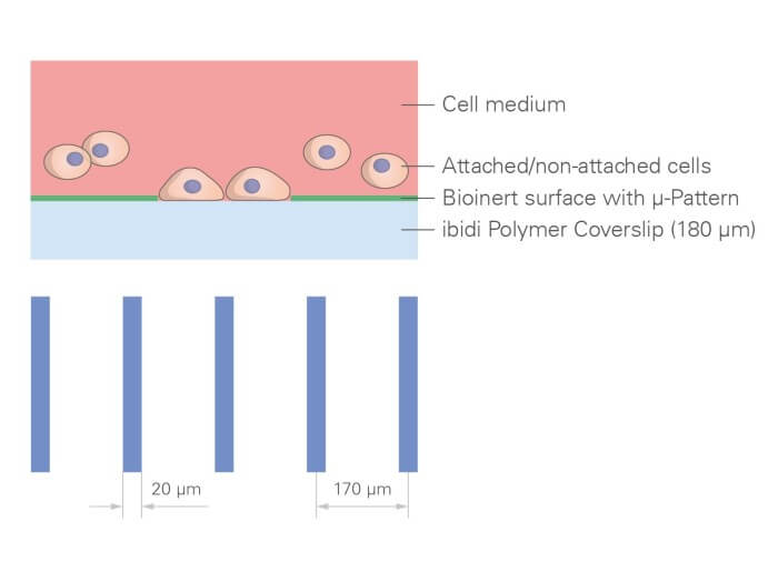 ?載玻片采用ibiTreat微圖案化表面,并由先進的 ibidi Bioinert 生物惰性表面包覆